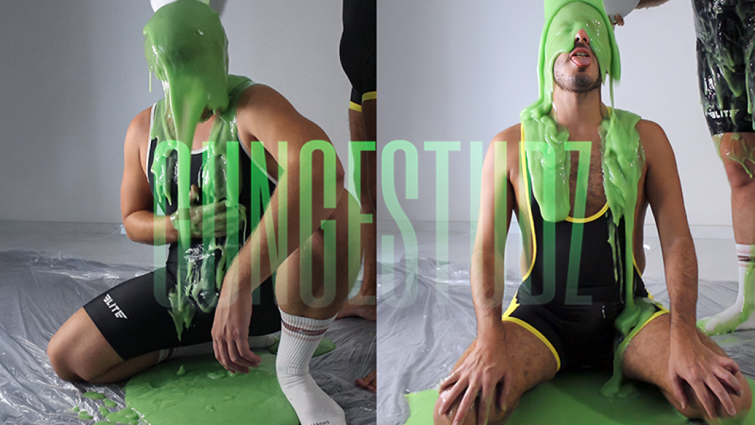 WM992 and Jocklad95 make out in black Lycra singlets, getting hard. They gunge each other green, then kiss and get all horny in the mess before exchanging huge mutual cum facials.